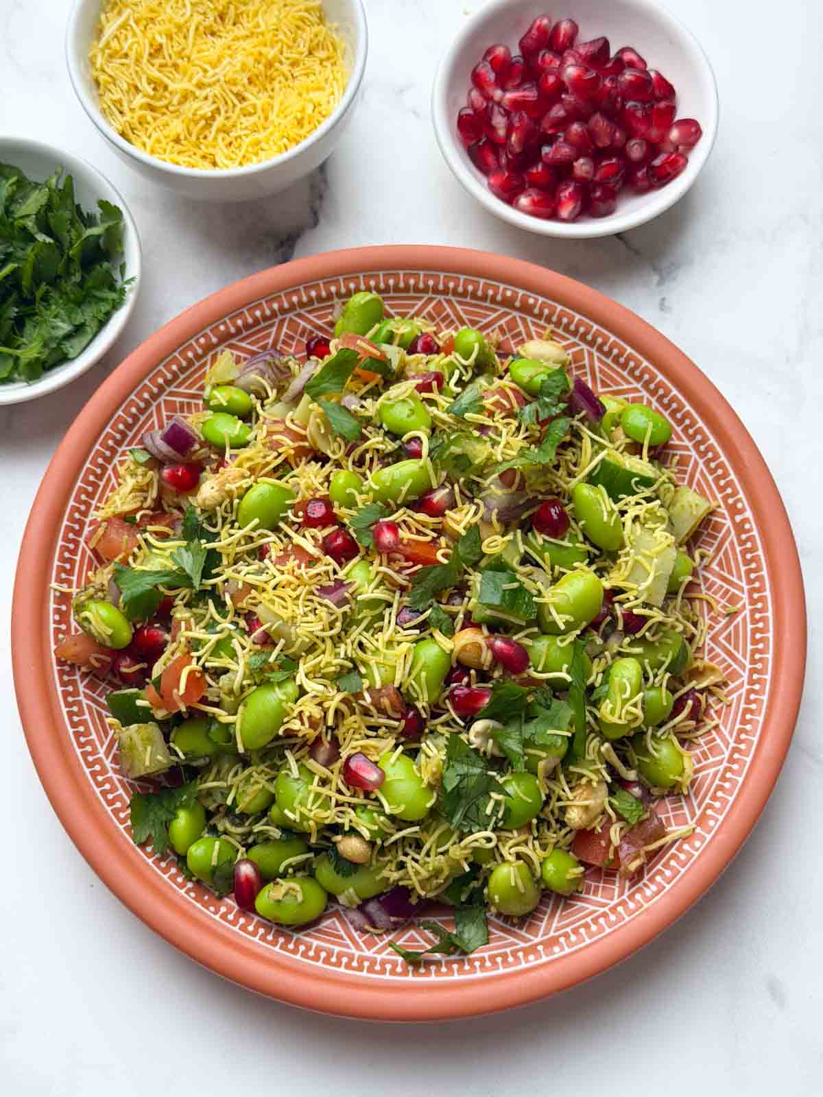 - In a large bowl, add edamame, veggies like boiled sweet potato, onion, tomato, cucumber, pomegranate seeds, roasted peanuts, green chutney, sweet tamarind chutney, lemon juice, spices like chaat masala, roasted cumin powder, salt, pepper, sev, and coriander leaves.