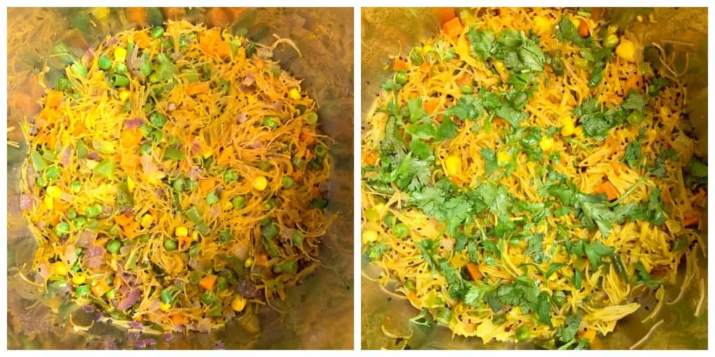 - Finally, remove the steel insert from the Instant Pot. Squeeze some lemon juice and garnish with fresh coriander leaves and freshly grated coconut, if desired. Gently fluff the vermicelli with a fork before serving.