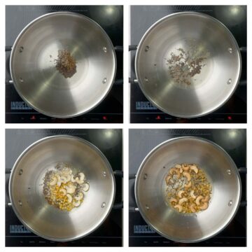 Add ½ teaspoon urad dal, 1 teaspoon chana dal (optional), and 6-8 cashew nuts. Saute until the dal turns to light golden color.