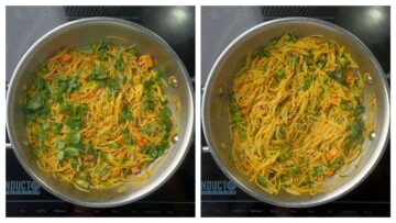 - Add the roasted vermicelli to the kadai and mix well. Cover and cook over medium-low heat until the vermicelli absorbs all the water completely.