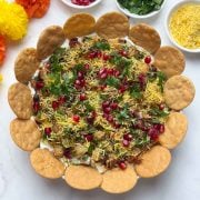 Finally, garnish with thin sev, pomegranate seeds, and coriander leaves. If serving immediately, place the papdis on the side; if serving later, keep the papdis separate to maintain their crispiness.This dip is good for a party of 5-6 people, assuming you are serving other appetizers alongside it.